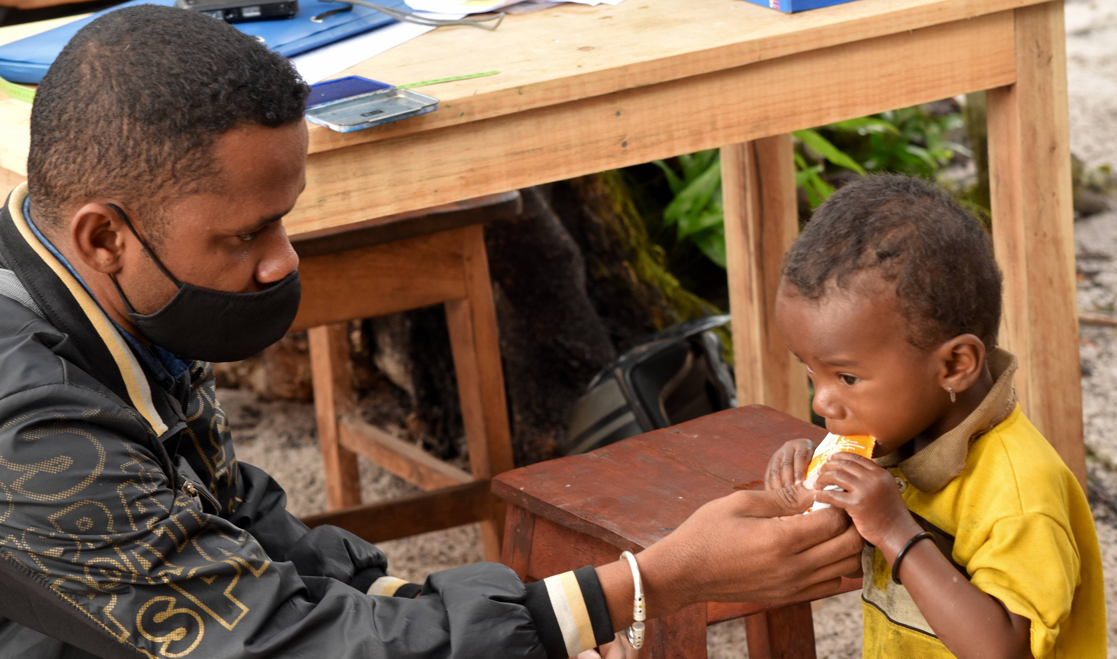| Emil, SEED's Data Collector, helping Mariane with emergency prepared food in Ebakika, Anosy. Photo: Daniel Wood |