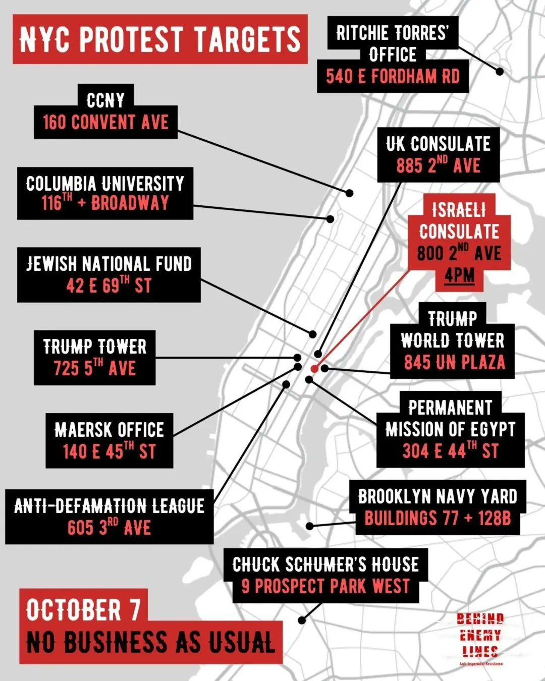 Organized under the banner "No Business as Usual—Behind Enemy Lines," these protests explicitly target Jewish institutions, Israeli consulates, Democratic offices, universities, and businesses linked to pro-Israel figures. Flyers circulating on social media urge "escalation" and "globalizing the intifada," rhetoric widely interpreted as incitement to violence against Jews and symbols of Western support for Israel.