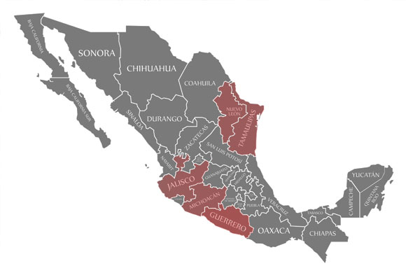 Locations: Jalisco State (including Puerto Vallarta, Chapala, and Guadalajara), Tamaulipas State (including Reynosa and other municipalities), areas of Michoacan State, Guerrero State, and Nuevo Leon State