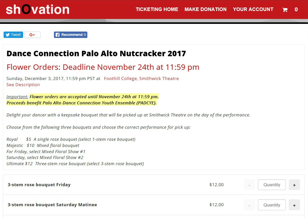 | ShOvation is proud to feature Merchandise Sales!! For many organizations, in addition to selling tickets, they are also selling additional merchandise for their events such as raffle tickets, t-shirts, DVDs, flowers, photos and more. In our continued effort to simplify the lives of our customers and their patrons, we pioneered offering merchandise sales on the same event homepage as your ticket sales! ShOvation has offered this feature for several years. Merchandise items are sold at a greatly reduced convenience fee to the patron. Another benefit of selling merchandise online with your tickets is easier fulfillment and inventory tracking with our online detailed reporting. You will have real-time access to dollar volume sold, quantity, sales potential and more for every item you sell. In additional you will have a report to track which customers have purchased which items and their contact information. We are the innovator of offering merchandise sales to our clients in the dance recital ticketing space!