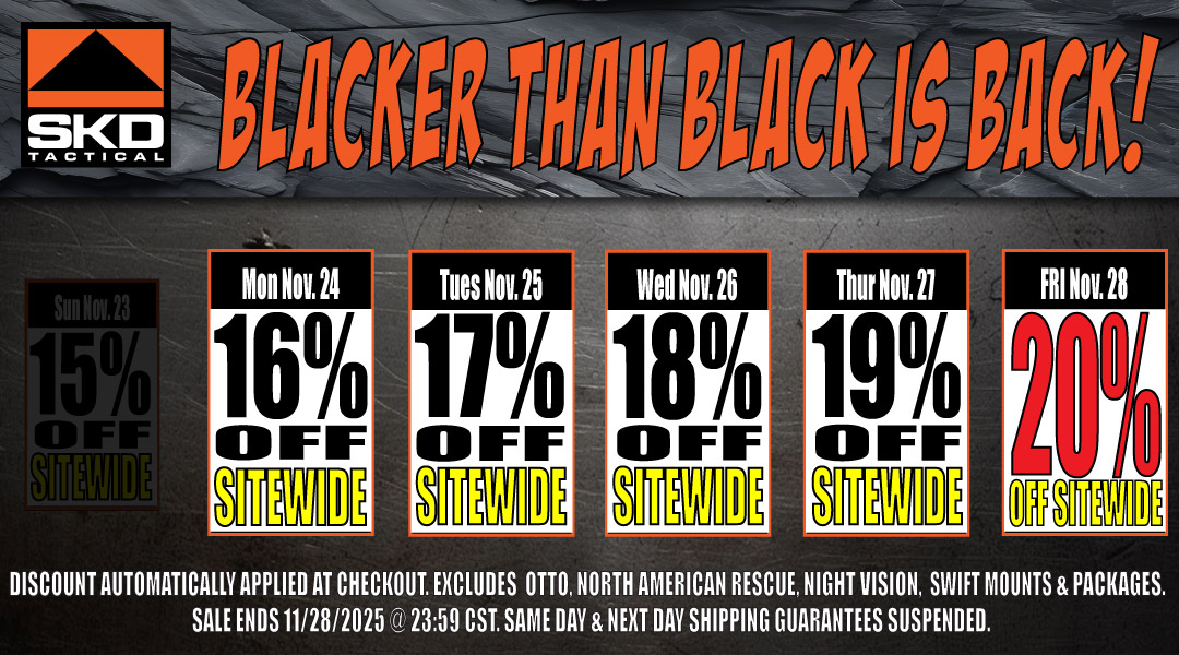 *Excluding Otto, North American Rescue, Swift Mounts, Night Vision & Packages. Shipping guarantees are suspended during the sale. Orders will ship on a First Come First Served basis.