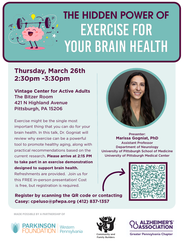 Join us on Thursday, March 26 from 2:30–3:30 PM at the Vintage Center for Active Adults for a free presentation on “The Hidden Power of Exercise for Your Brain Health.” Dr. Marissa Cognati from the University of Pittsburgh will share how exercise can support brain health and healthy aging, along with practical tips based on current research. Guests are encouraged to arrive at 2:15 PM to participate in a brief exercise demonstration.