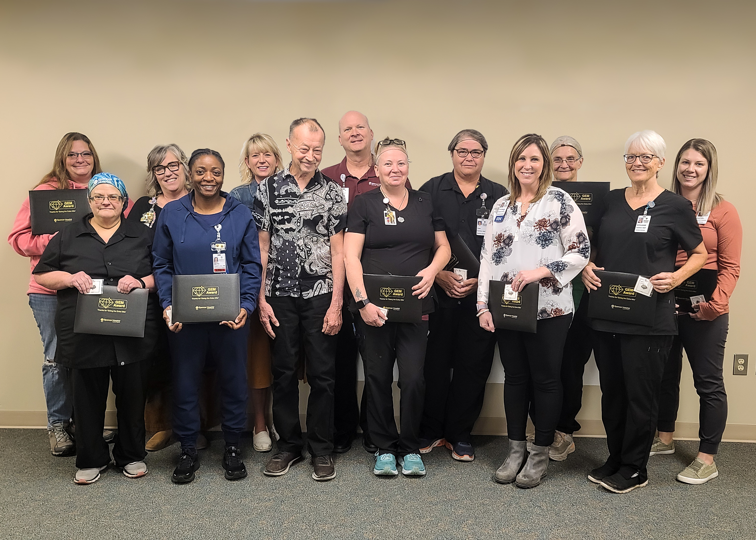 “If you want to lift yourself up, lift up someone else.” – Booker T. Washington Our Spencer Hospital co-worker Chuck brings smiles to many faces – patients and co-workers alike – through his kindness. So, when Chuck, one of our Nutrition Services professionals, was temporarily laid up following an accident, his co-workers responded with similar caring gestures, helping him out in numerous ways. In recognition of those “Team Chuck” co-workers, this group has been honored with the very first Team GEM Award. GEM stands for “going the extra mile” and these co-workers happily provided extra help to assist Chuck during his recovery. Those honored as part of “Team Chuck” hail from a number of different departments, including his own Nutrition Services teammates to HR, physical therapy, home health and the birth center. Many thanks and congrats to our “Team Chuck” members – Mari Howard, Roxanne Maeyaert, Beth Hopkins, Kaylee Hopkins, Sharon Frederick, Laila Wolterman, Lisa Porter, Tracey Erb, Rachel Hoffman, Tatum Geerdes, Michael Schauer, Patty Schulz and Jeannette Hasley! |