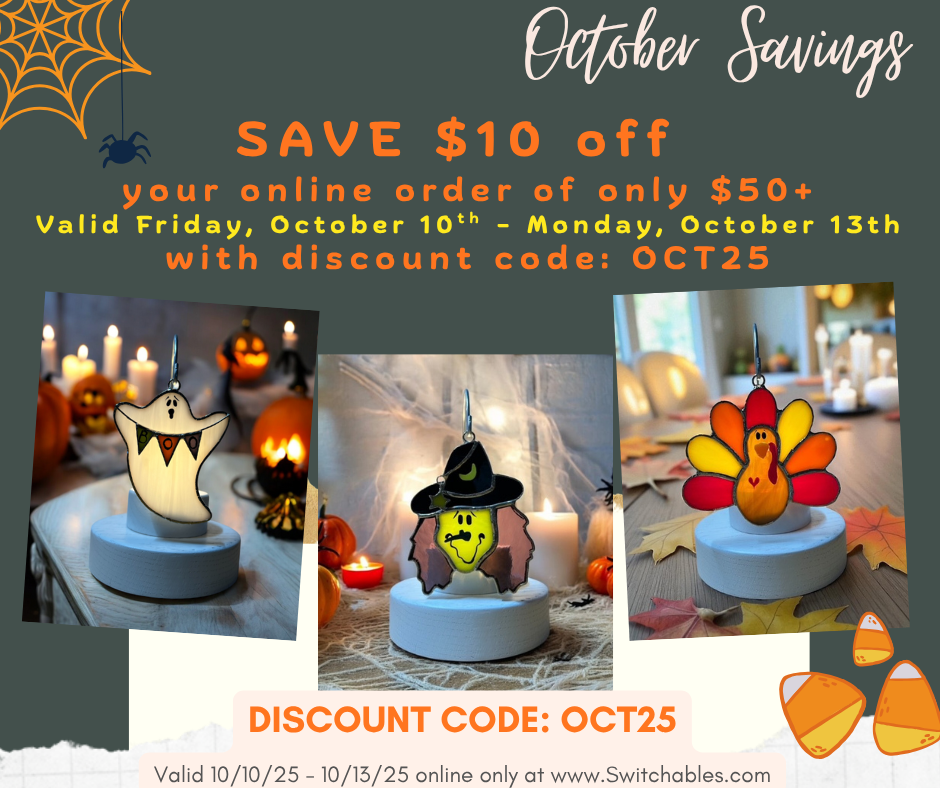 | Good morning Switchables Family. 🧡 October SAVINGS is HERE!!! Just place a $50 minimum online order at www.Switchables.com between October 10th and Monday October 13th ... and enter discount code: OCT25 at checkout to SAVE $10 OFF your order!!! FREE SHIPPING on orders $125+ after any discount applied. | | |