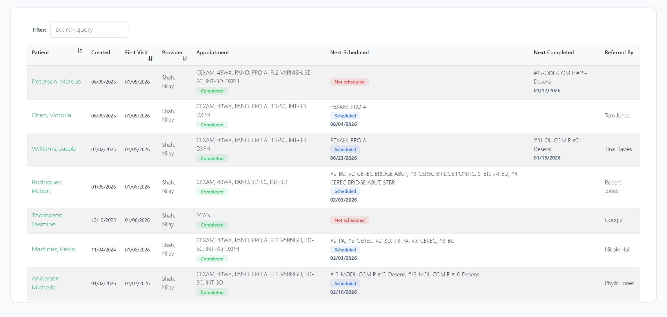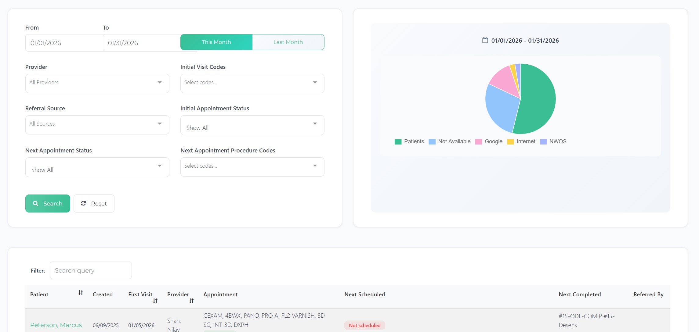 And for each of the new patients, you should be able to see in the columns the following information: When the appointment was CREATED in Open Dental Date of their first visit Description of their New patient appointment and Status (scheduled / completed) Next Scheduled: If a new patient has already completed their initial appointment, the Next Scheduled column will show ANYTHING that is in "scheduled' status in Open Dental AFTER the date of the initial appointment along with procedures in those appointment Next Completed (or Recently Completed): Any appointment that is "completed" status in Open Dental that falls on the same day as their new patient appointment or in future. Referred By: Lists the patient name who referred this patient, or if your team is marking in Open Dental where the patients are coming from (billboards, google ad, FB ads, fliers, etc.) - it will show up here.