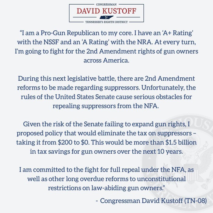 This weekend Ammoland broke a news report that identifies Tennessee Congressman David Kustoff as a serious problem (it also identified former NRA operative Chris Cox as part of the problem!). Apparently, rather that supporting 2nd Amendment based efforts to repeal the transfer and registration tax on suppressors, Congressman Kustoff was telling Tennesseans to "kissoff" rather as he instead was advocating for merely reducing the fee from $200 to $5.