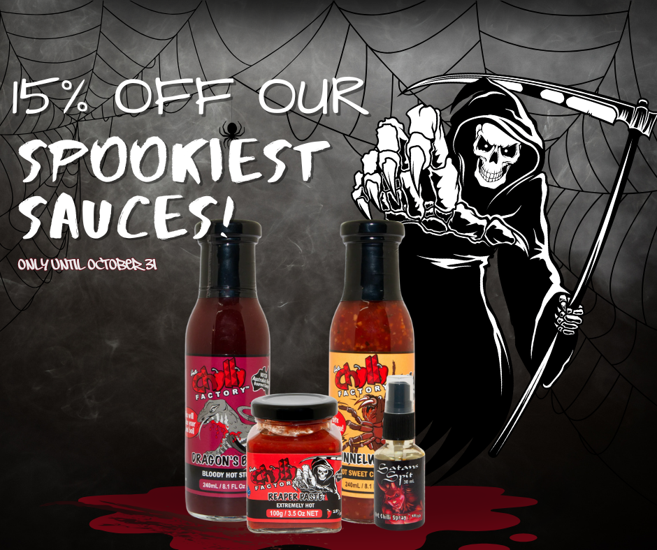 This Halloween, things are heating up at The Chilli Factory! Enjoy 15% off our spookiest sauces, Funnelweb Bite, Dragon's Blood, Reaper Paste, and Satans Spit. The perfect treat for those who like a little scare in every bite. This wicked offer vanishes on October 31st!