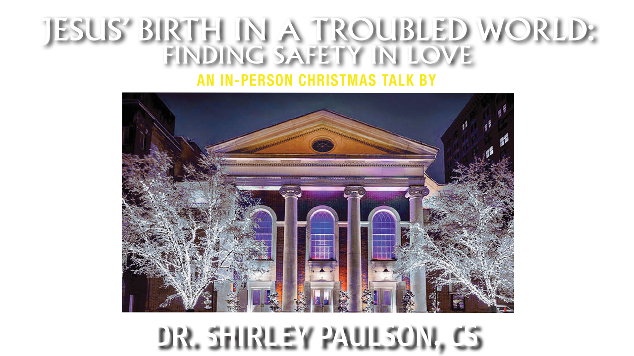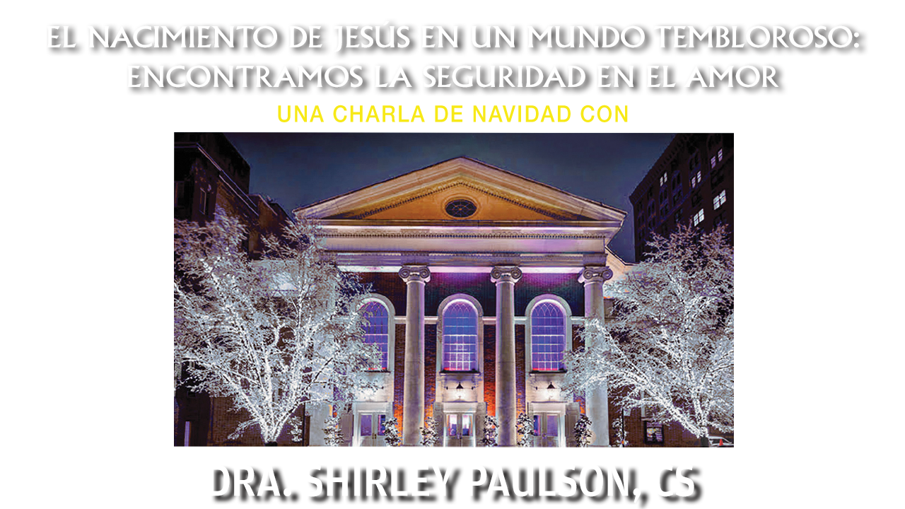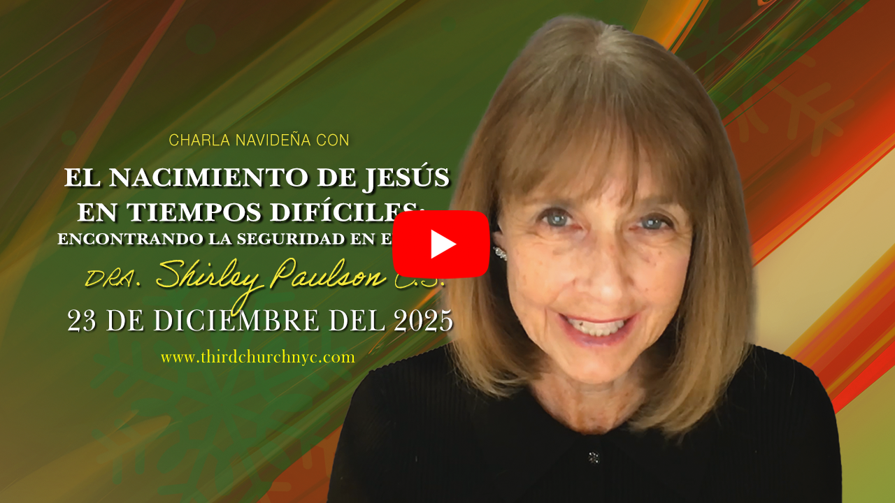 Queridos amigos, La luz transformadora que Jesús trajo al mundo: ¿puede sanar los tiempos más oscuros de hoy? La luz del Cristo Viviente nos sigue brindando esperanza, amor y sanación, en un mundo que anhela la paz. Acompáñenos esta navidad para una charla titulada El nacimiento de Jesús en un mundo tembloroso: encontramos la seguridad en el amor, con la Dra. Shirley Paulson CS., y explore cómo el regalo de Jesús nos puede transformar por dentro y por fuera, cambiando el mundo para bien.Son cordialmente invitados a una alegre velada navideña con la tercera iglesia. Comenzará a las 7:15 p. m. con música navideña, seguida por una inspiradora charla navideña dado por la conferencista reconocida Shirley Paulson, desde las 7:30 p.m., el 23 de diciembre en el Three West Club. La dirección es: 3 West 51st Street @ 5th Avenue, en el Grand Salon Room, tercer piso. La charla de Shirley comenzará a las 7:30 PM (hora del Este), precedida por música navideña a las 7:15 PM.Favor de llamarnos por teléfono al 212-838-1870 con cualquier duda o pregunta.