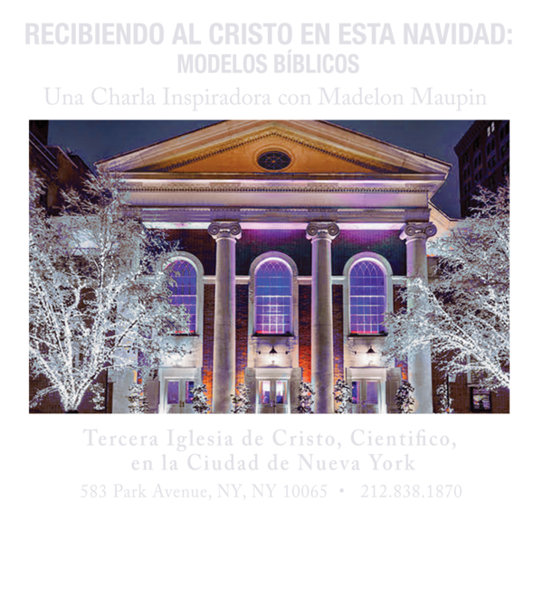 We invite you, our friends all over the world, to join us for a free talk on Christmas Eve, December 24th, entitled “Welcoming Christ This Christmas: Biblical Role Models” given by Bible speaker Madelon Maupin, at Third Church of Christ, Scientist, in New York City.