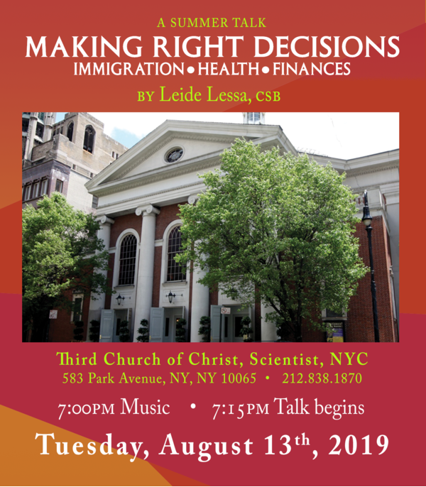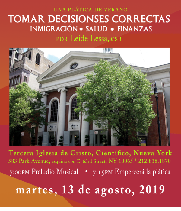 If you aren't able to attend in person, wherever you are in the world, you can join us for the live online webcast of this event at ThirdChurchNYC.com. You can also listen via conference phone for English at 1 (310) 372-7549 & access code 607611 and for Spanish at 1 (310) 372-7549 & access code 7474. For more information, contact us at 212-838-1870. We look forward to seeing you!