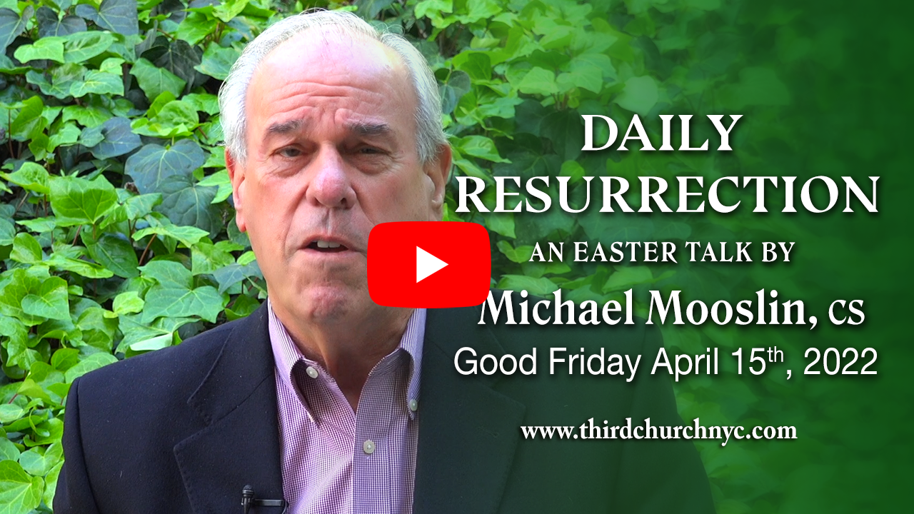 This Easter talk will inspire a daily resurrection in thought that can transcend mortal limitations, discord, and disease. The talk features biblical insights and testimonies from those who have followed the ascending path spirit-ward. Michael Mooslin, CS will give a talk on Good Friday, April 15th, at 7:30 pm Eastern Time entitled “Daily Resurrection”.