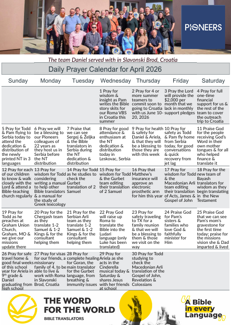 April 5 Pray for Todd & Pam flying to Serbia today to attend the dedication & distribution of the newly printed NT in 3 languages