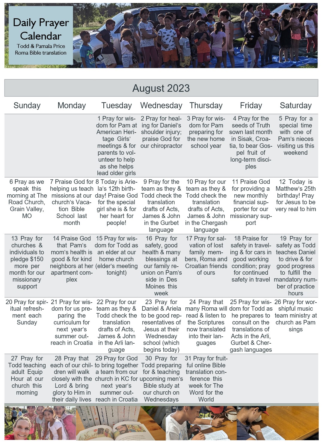 August 29 Pray for God to bring together a team from our church in KC for next year’s summer outreach in Croatia