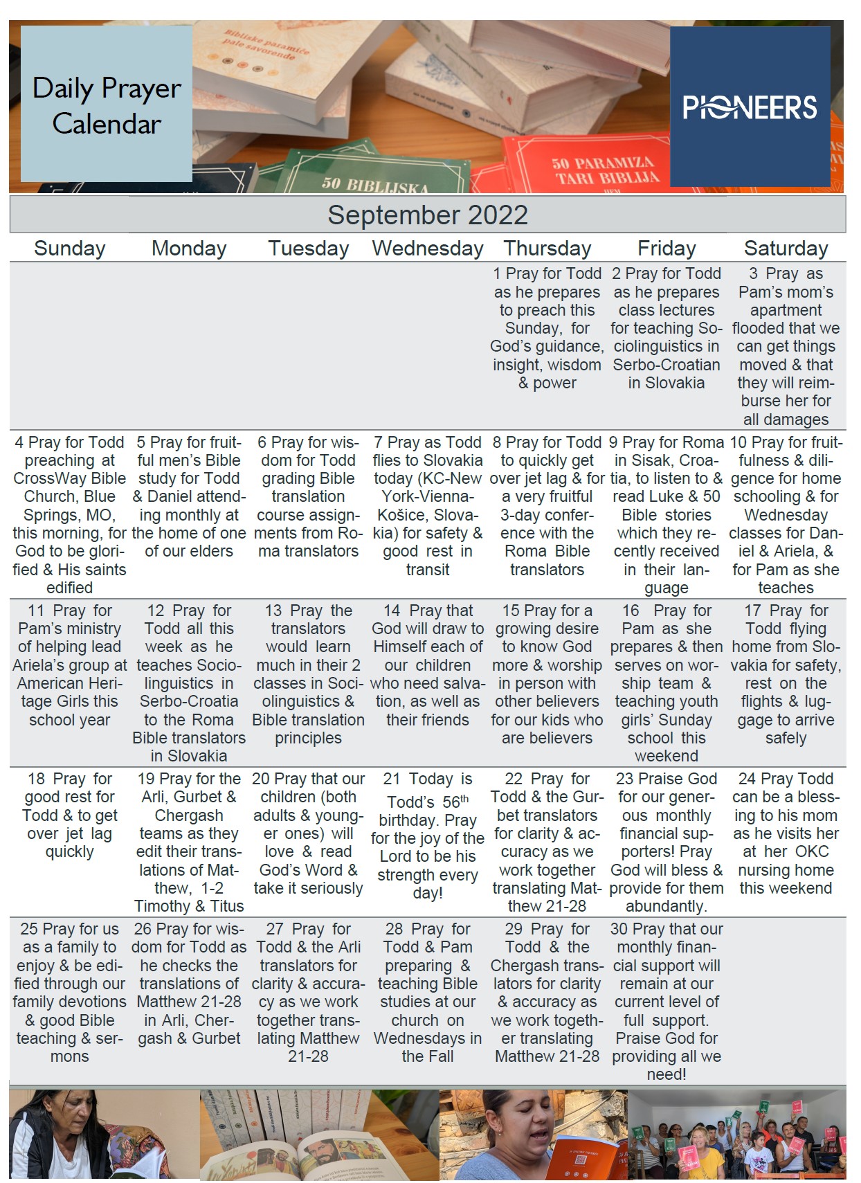 September 30 Pray that our monthly financial support will remain at our current level of full support. Praise God for providing all we need!