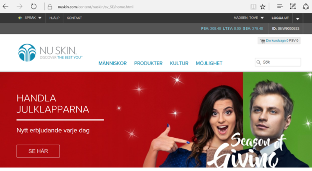 Hur har du det? Jag hoppas att du mår riktigt bra! Ledsen att jag inte skrivit på länge! Förra helgen stod jag på en julmarknad med eget bord och hade fin röd luva och röd kjol och när jag hälsade på den lilla flickan så sa jag att jag var tomtemamma. Nähä, sa flickan. Jaså, sa jag. Vad är jag då? Undrade jag. Du är Tomtemor. Nu är det äntligen december och på något konstigt vis går intensiteten upp hos mig med flera, men när vi väl landar i julhelgen ska det väl bli balans igen! Några tips till tomten som letar klappar kan vara att ta helgen till att beställa på nätet och sedan ägna resten av december till att slå in klappar och njuta av glöggen! NuSkin erbjuder varje dag fram till 14 december extra prisvärda produkter till mycket reducerat fraktpris, logga in på ditt konto så ser du priset som förmåskund. Använd dina poäng! Jag gjort en kort film, se nedan, som visar hur du handlar gratis med poäng eller byter till leverans varje månad eller ändrar till nytt datum för leverans. Jag har adderat min favoritlista av produkter, vilka gillar du? Om du vill göra din julhandel på nätet så kan jag också rekommendera min egen nyöppnade webshop nordifcriend.se för mina kunder i Sverige. Nordiska och bra produkter utlovas! Trevlig läsning och må gott! Till sist vill jag avsluta som jag började men en önskan om en fin 2:a Advent och en God Jul och Gott Nytt År! Tove Madsen Hör gärna av dig om du har frågor! tove.madsen@seglaut.se 070 769 5487 Du får detta nyhetsbrev för att Du är en viktig kund till mig av Nuskins produkter. Vill du inte ha nyhetsbreven kan du göra unsubscribe längst ned i brevet.