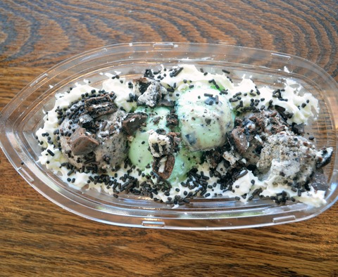 Mint Chocolate Chip and Cookies n' Cream ice cream topped with whipped cream, crushed Oreos, and chocolate sprinkles. Available