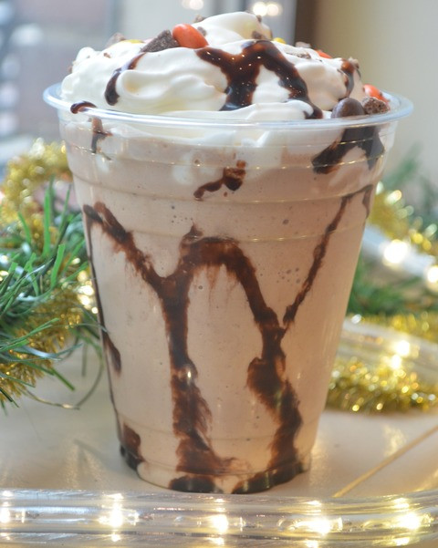 Vanilla and chocolate ice cream blended with chopped Reese's cups, then topped with whipped