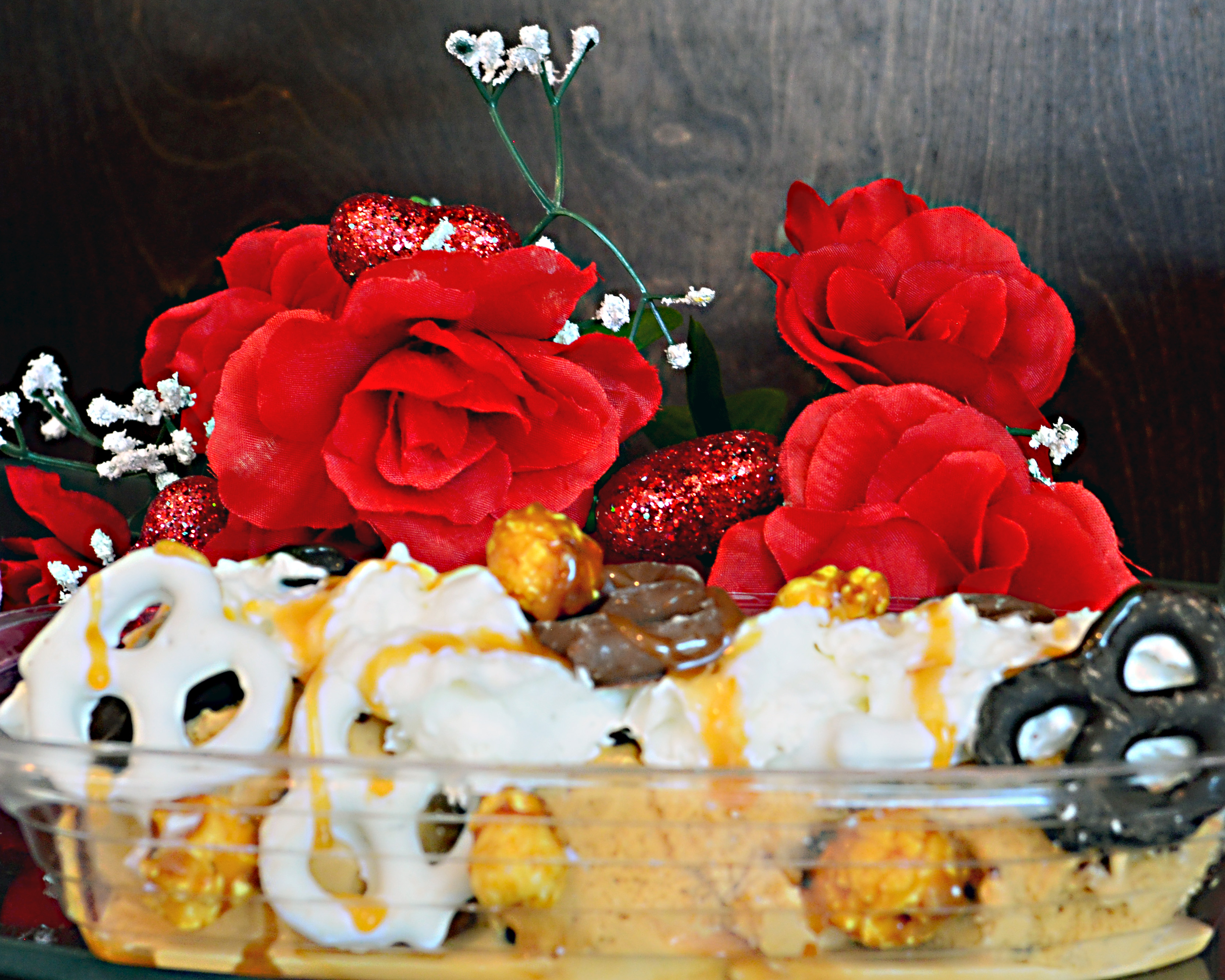 cream, caramel corn, white chocolate pretzels, dark chocolate pretzels, milk chocolate pretzels and caramel drizzle. Available at Charley Creek Inn Ice Cream