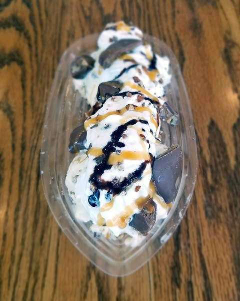 Butter pecan ice cream topped with whipped cream, pecan patties, buttered almond pieces, chocolate syrup, caramel syrup, and served in a dished coated with waffle cone pieces. Available at Charley Creek Inn Ice Cream