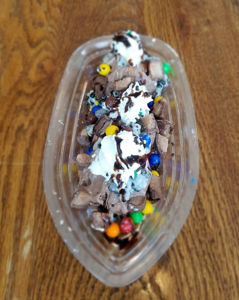 Chocolate ice cream topped with melted cookies n' cream candy bar, whipped cream, chocolate sprinkles, Sixlets, chunks of milk chocolate creams, chocolate syrup, and served in a dished coated with waffle cone pieces. Available at Charley Creek Inn Ice Cream