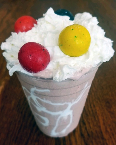 topped with whipped cream and gumballs, and served in a glass swirled