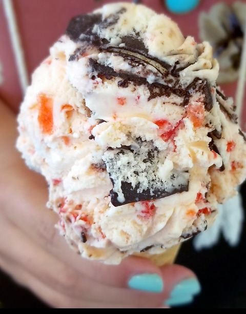 chunks of cherries and a thick fudge ripple blended into a creamy amaretto ice