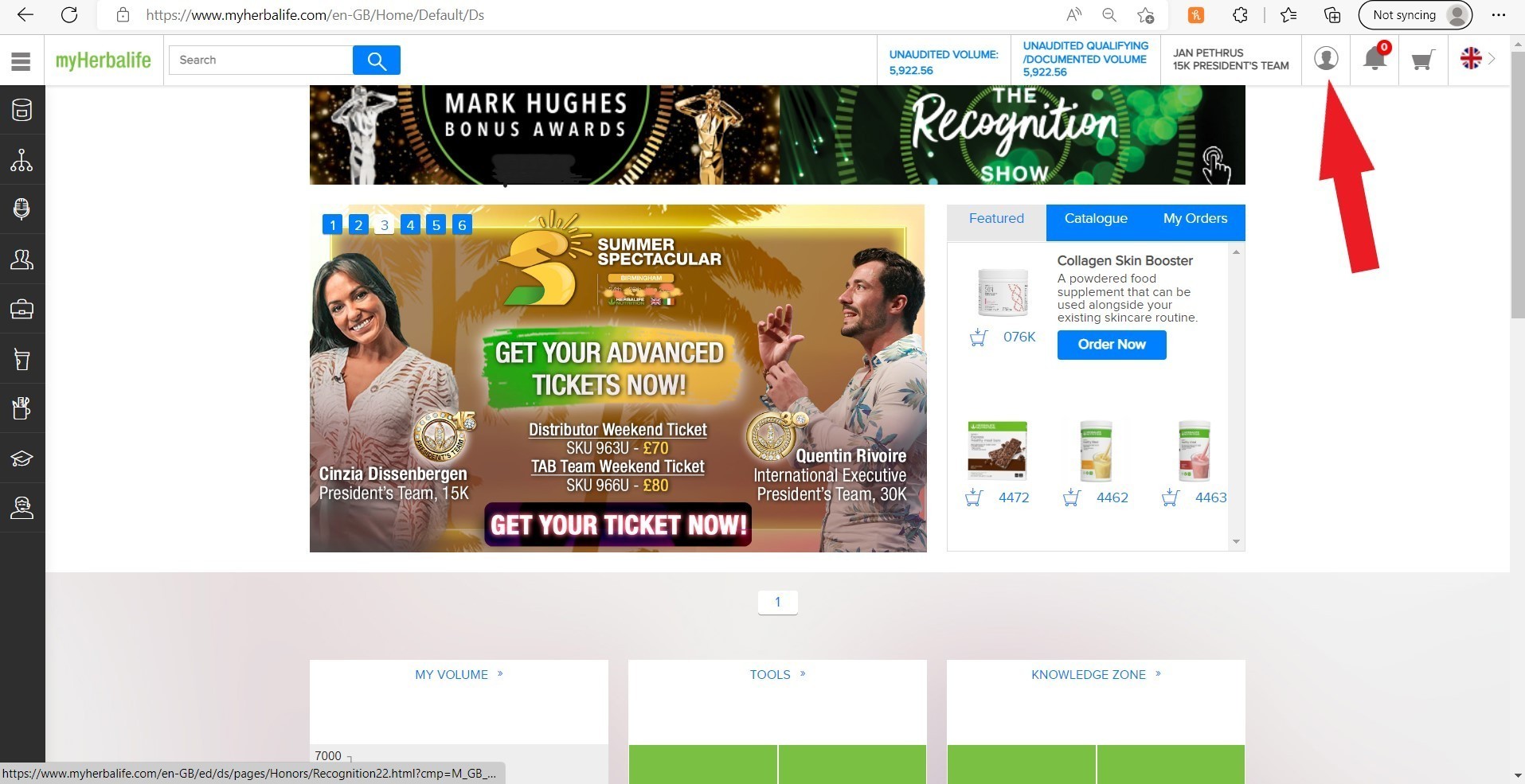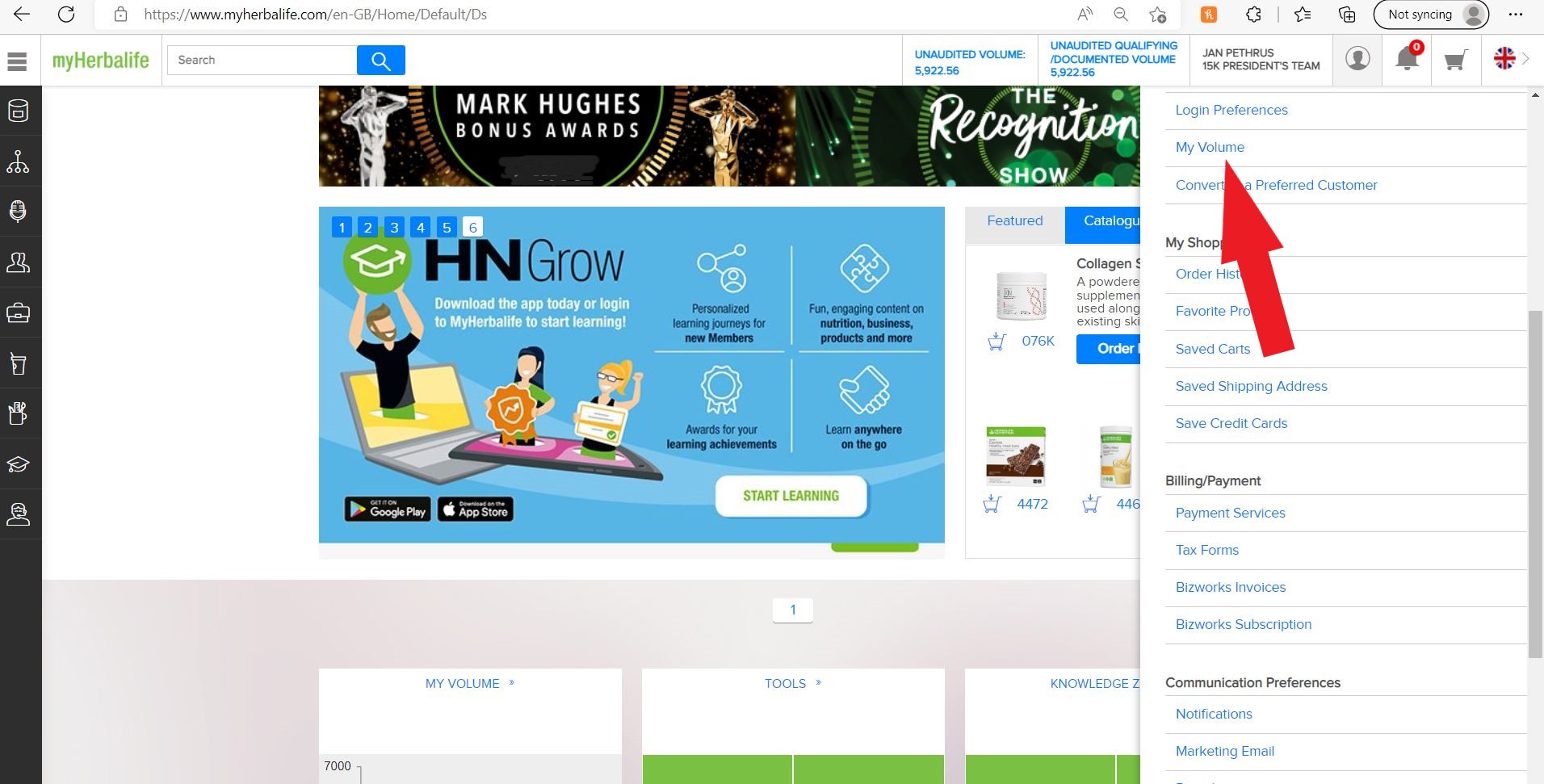 | 2. Scroll down and Click on 'My Volume' | | Any questions regarding Volume Points, Qualifications, Promotions... ?! Please don't hesitate to contact me. WhatsApp (07920 888 400) is always very quick and easy 🙂 | |