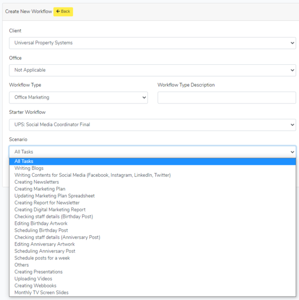 To create a new task they just have to fill out the form below with the client name, office, workflow type, description and scenario.