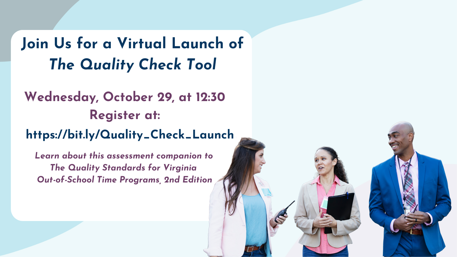Join the virtual launch of VPOST's new Quality Check Tool today at 12:30 PM. During this 30-minute lunch-and-learn style session, Professional Development and Quality Coordinator Christine Jones Monaccio, will introduce this easy-to-use tool, designed to correspond with the Quality Standards for Virginia Out-of-School Time Programs. The Quality Check walks users through a step-by-step process to assess program quality, facilitate group conversations, and set meaningful goals. Don’t miss this chance to explore how the tool can support continuous improvement in your program. Register using this link, and if you have any questions, please contact Christine. |