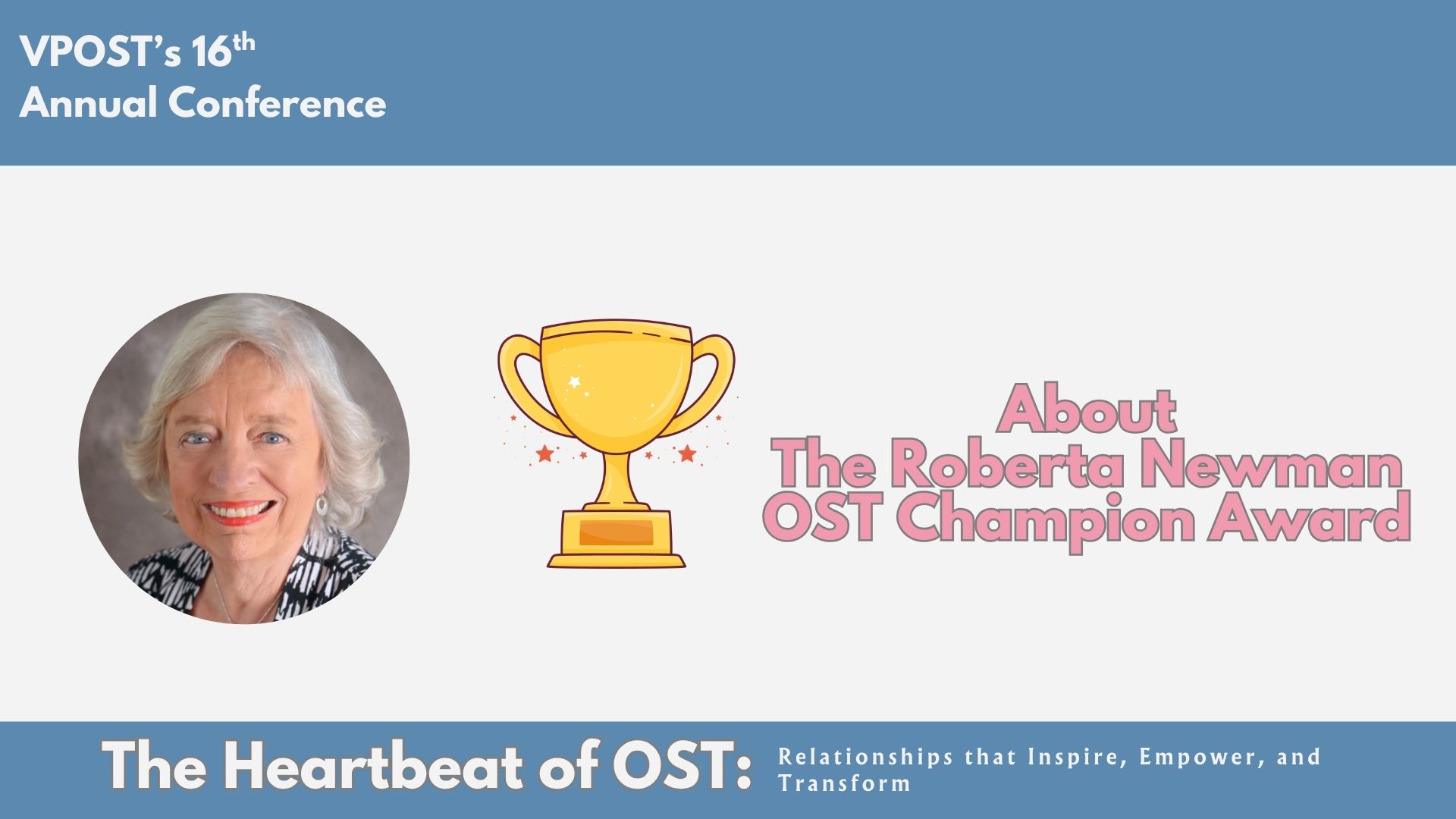 Presenting the Out of School Time Champion Awards to deserving individuals is always a highlight at the VPOST annual conference. This year, though, was even more special, as we renamed the award in honor of Roberta Newman, a nationally recognized leader, trainer, author, and force of nature in the world of child and youth development!