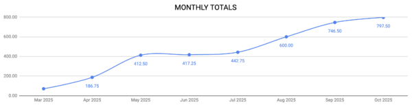 ● Mar 2025: +70.25pts ● Apr 2025: +116.50pts ● May 2025: +225.75pts ● Jun 2025: +4.75pts ● Jul 2025: +25.50pts ● Aug 2025: +157.25pts ● Sep 2025: +146.50pts ● Oct 2025: +51pts