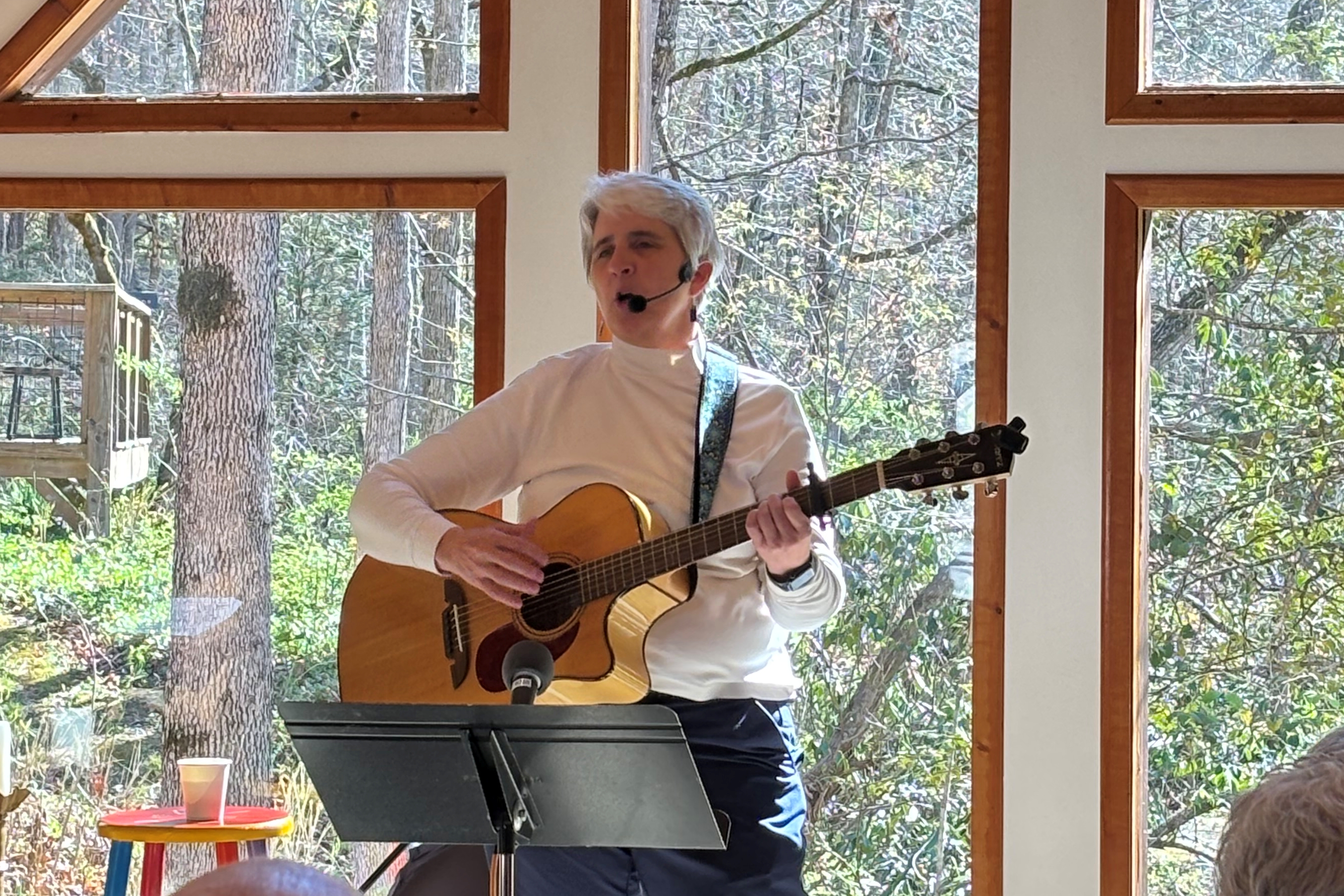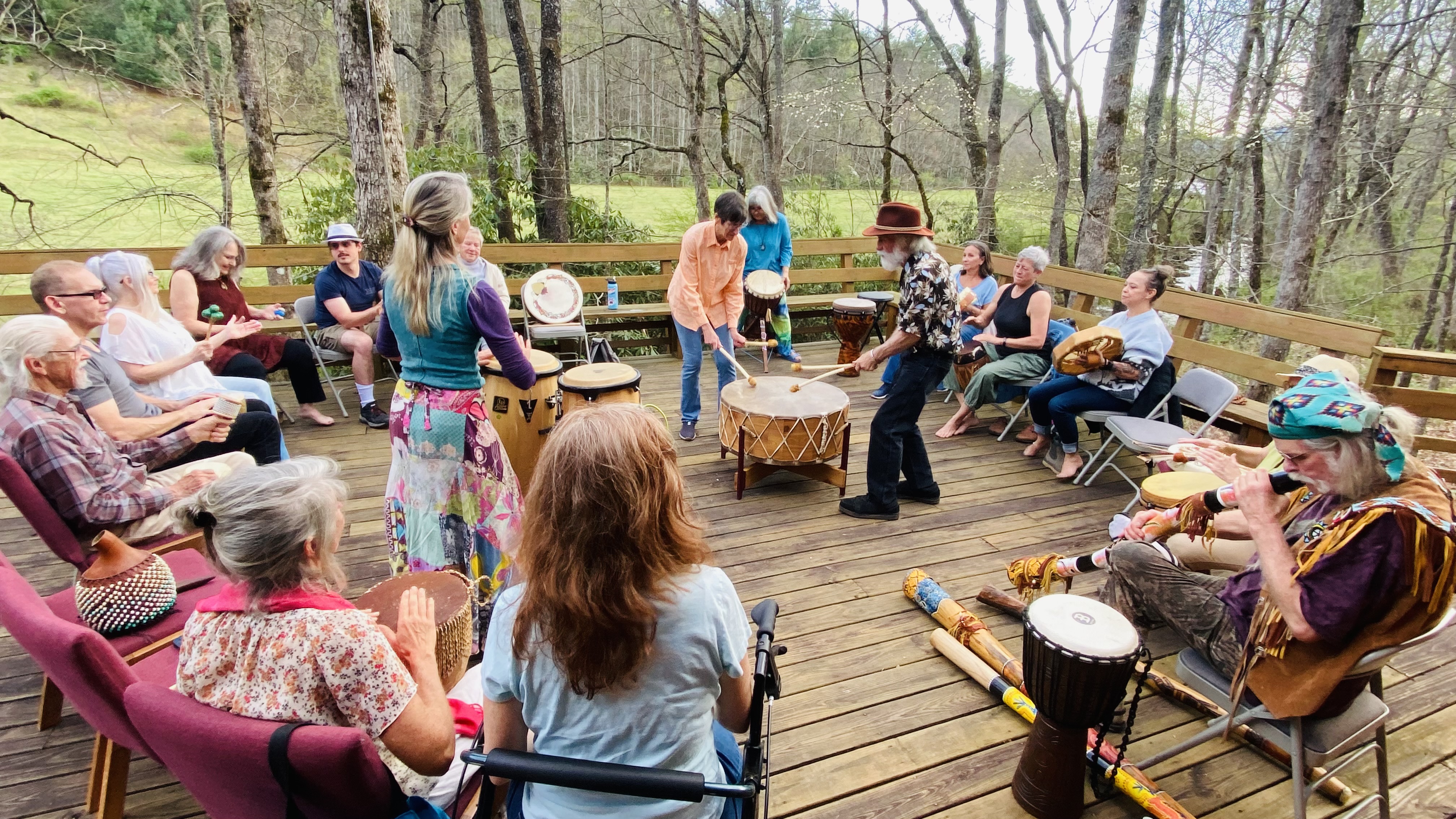 Whether you start with planting or eating, it's all good as we celebrate LIFE together! | | Twenty folks joined together on the chapel deck for the full moon drum circle on Wednesday 4/1. With drums, all kinds of percussion instruments, digeridoos, and inspired vocals, we had a grand time flowing with the beat. | | If you missed it, no worries. We'll have another one next month! Watch the newsletter and/or website for the exact date. | | ROBERTO OBREGON (2-4 PM, Sunday, April 12) World class guitarist, singer, and composer ROBERTO OBREGON will perform Sunday, April 12, from 2-4 pm in the dappled shade of the Wayfarers deck overlooking the beautiful Estatoah Creek.