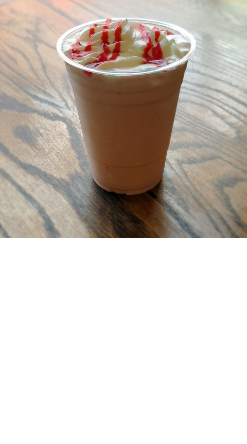 Strawberry ice cream blended, then topped with whipped cream and