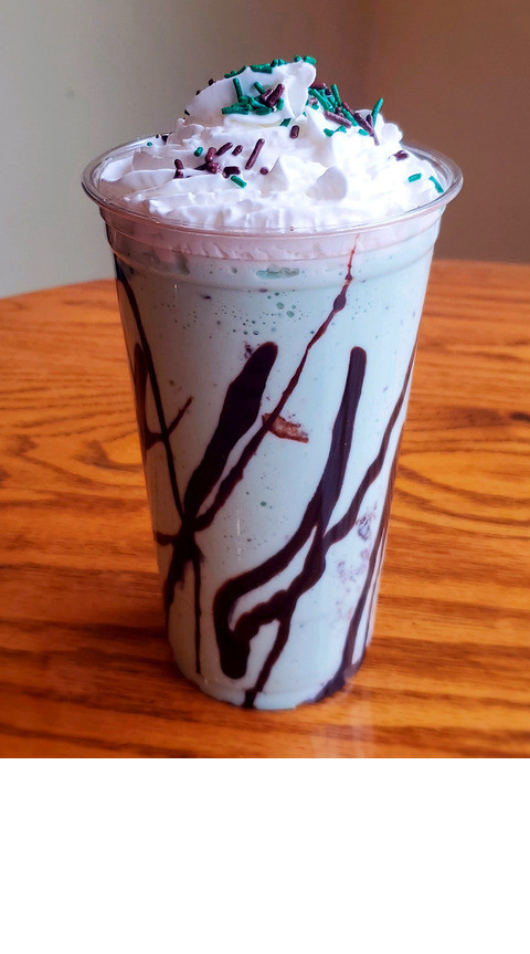 Mint chocolate chip ice cream blended, then topped with whipped cream