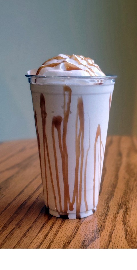 ice cream blended and served in a glass swirled with caramel syrup, then topped