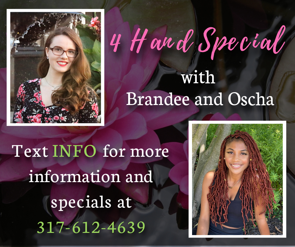 Hello! I just wanted to let you know that we have a new young lady who will be joining our team. Her name is Oscha... And she will be starting with us next week. To start out she will be working with me doing 4 Hand. We will be taking appointments Thursday 20th Friday 21st Sunday 23rd Let me know what day works best for you by TEXTING ME AT 317-612-4639 Don't forget to ask about our 4 Hand Special!!!! And we look forward to seeing you soon! Thanks, Brandee |