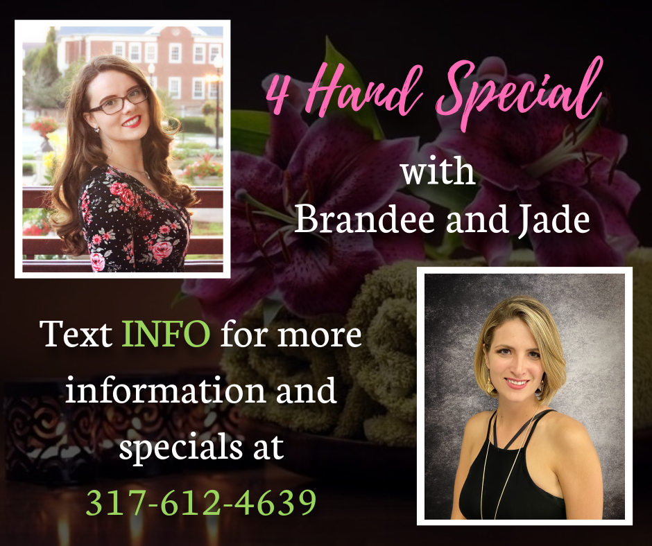 Hello again! Wow it has been really busy here at 317 Holistic Health!!! And with us being so busy we have hired on yet another person to the team. Her name is Jade and she will be starting with us today. To start out she will be working with me offering 4 Hand. Today we're available at... 3pm 6pm 7pm 9pm Let me know what time works best for you by Texting me at 317-612-4639 We look forward to seeing you! Thanks Brandee |