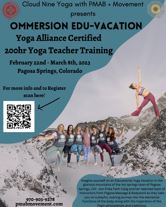Join me for a 2-week in-person 200-hr Yoga Training Immersion in beautiful Pagosa Springs, CO February 22 - March 8. Finish that Certification in an Edu-vacation format so you can begin sharing Yoga with your community. I have discounted the tuition to $1995 ($1000 off!). I'll credit students who have already enrolled in the self-paced course and want to upgrade to the in-person option! I am also offering Yoga Teachers who are interested in getting their Trainer Status (currently enrolled in the 300-hr or have graduated as a 500 RYT) to attend the training at a special graduate internship rate to receive hours toward E-RYT designation and qualify to teach the Cloud Nine Yoga 200 RYT curriculum!
