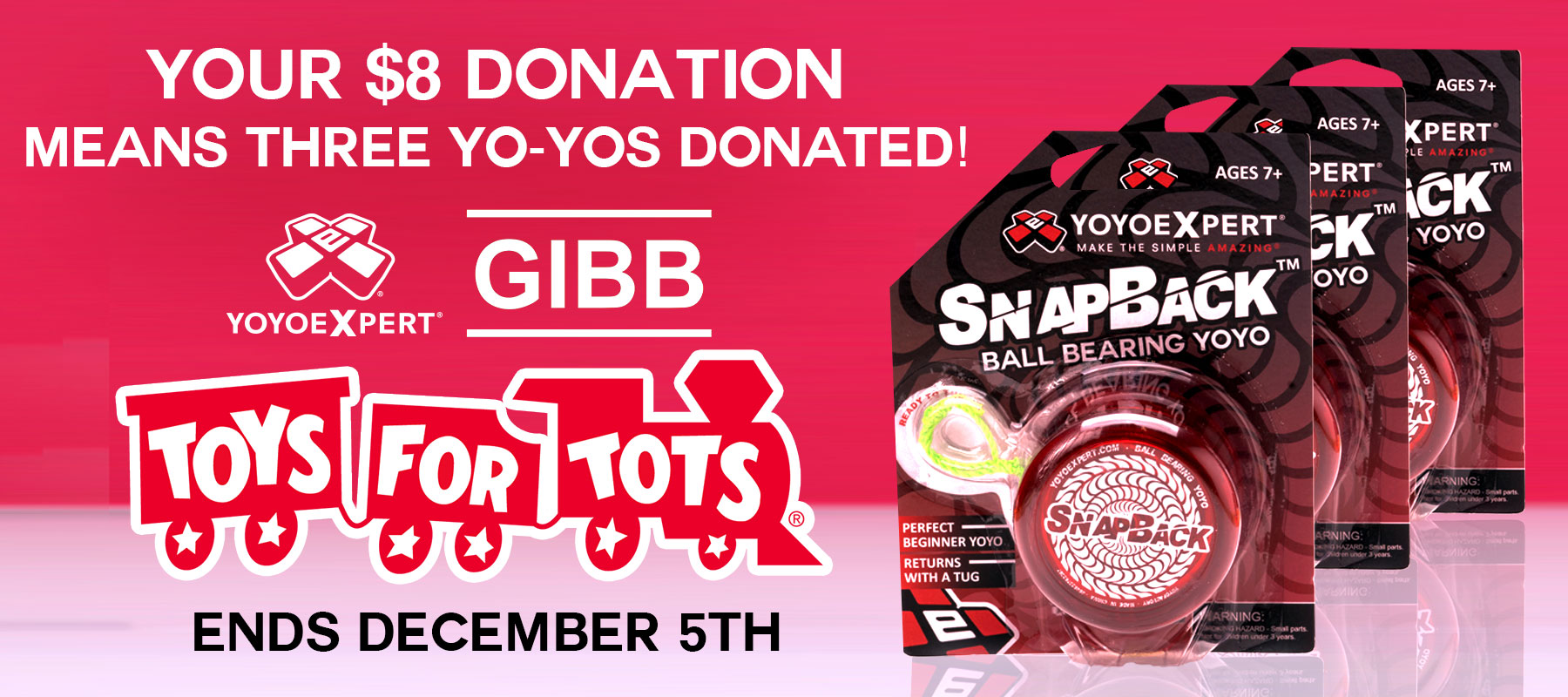 Together YoYoExpert and Gibb have teamed up to make your donation really count. For every $8 donation made we will donate a total of THREE of our new SnapBack Beginner YoYo!